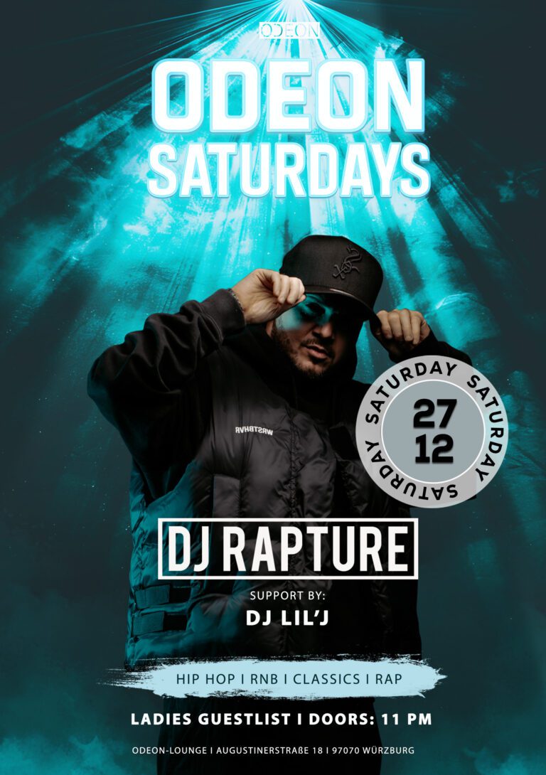 ODEON SATURDAY´S - Jeden Samstag mit den Besten DJs der nationalen und internationalen DJ - Szene! Wir freuen uns auf eine unvergessliche Nacht! Hip Hop, RnB, Rap & Classics by DJ RAPTURE & support by DJ LIL´J! ✖️ EINLASS: AB 23:00 UHR ✖️ #TISCHRESERVIERUNG: info@odeon-lounge.de
