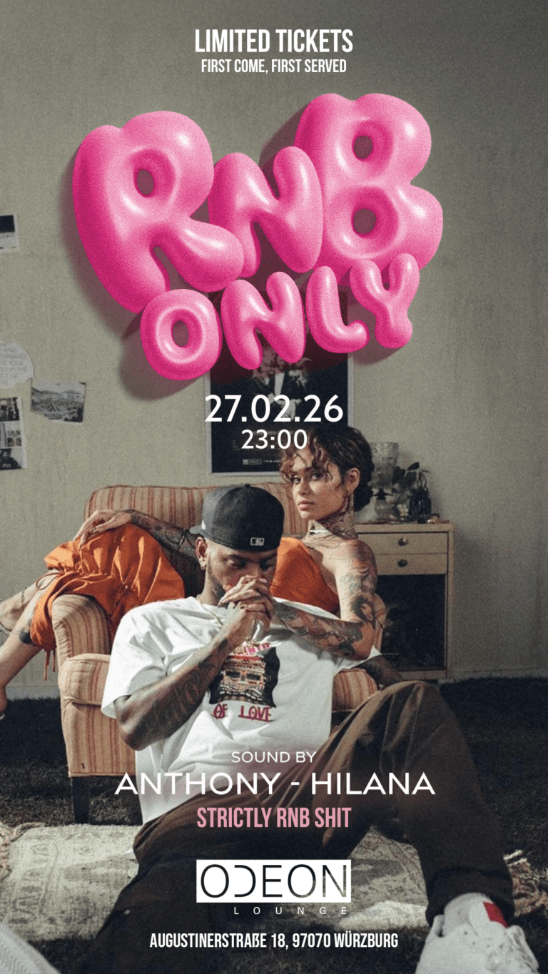 WÜRZBURG – we’re back in town! We’re bringing our signature RnB ONLY vibes back again to @odeonlounge in Würzburg City 🔥 Expect the best in R&B – from timeless classics to today’s hottest tracks by our good friend @hilana.official and our resident @anthony.dwayne_ 🎤✨ 📅 27.02.26 🕚 23:00 – 5:00 📍 Odeon Lounge – Augustinerstraße 18 in 97070 Würzburg Excited to be back in Würzburg and to party with y’all ❤️ Get your tickets now. Link in Bio 🎟️ Save the date and tell a friend 🫶