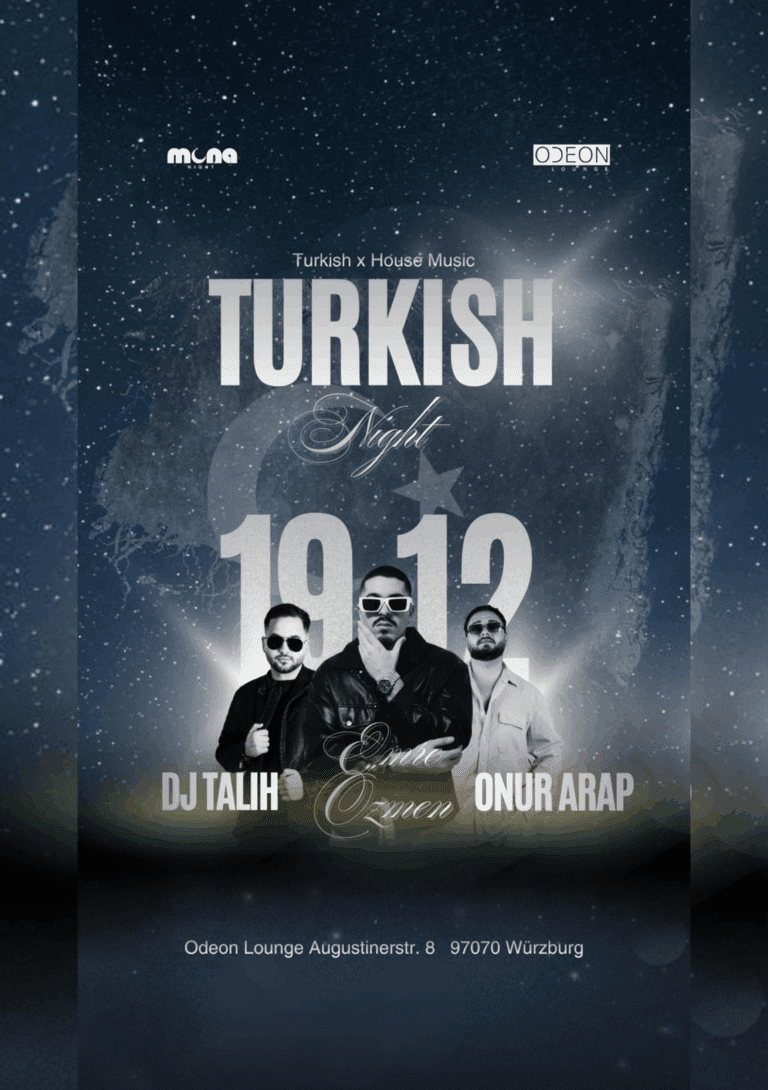 Am 19. Dezember findet die erste Turkish Night statt in der Odeon-Lounge schon ab 23:00 Uhr sind die Türen für euch geöffnet 18+ Eintritt Als Special für die Nacht haben wir für euch: Bis 0 Uhr Ladys 2+1 (kommt zu zweit, zahlt eins) Eine Flasche RedLabel + filler nur 100€ All Night Long @emreoezmen @djonurarap @dj.talih Wir freuen uns auf euch!